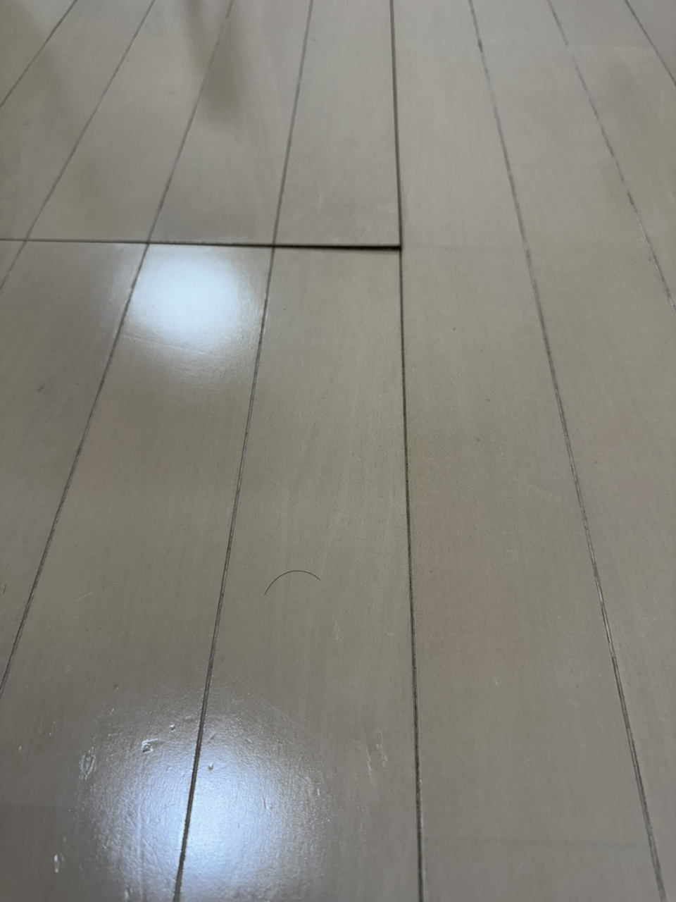 現場を確認すると、床材のめくれがかなり進行している状態。まずは補修箇所の周囲を丁寧にマスキングし、作業範囲をしっかり確保します。
