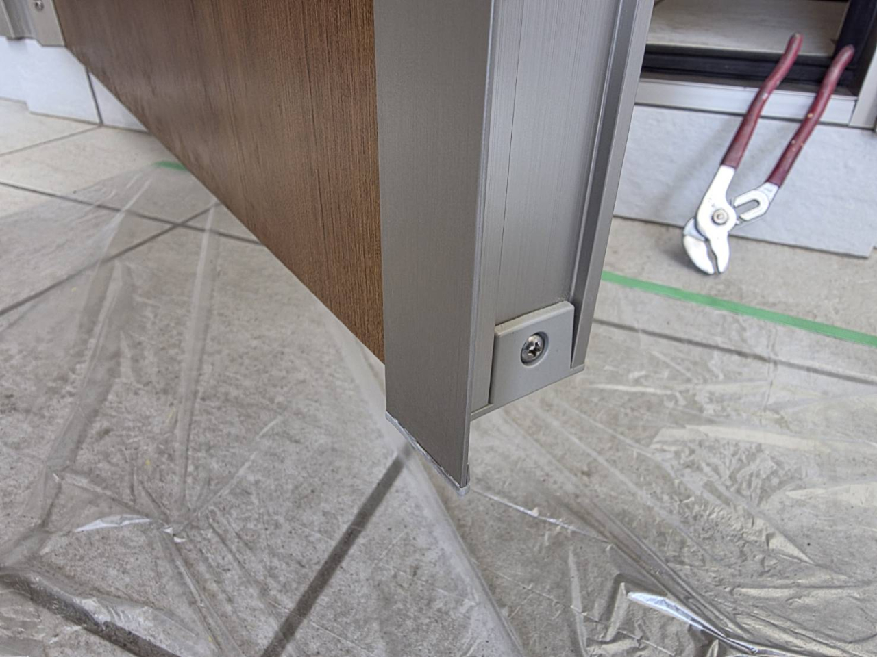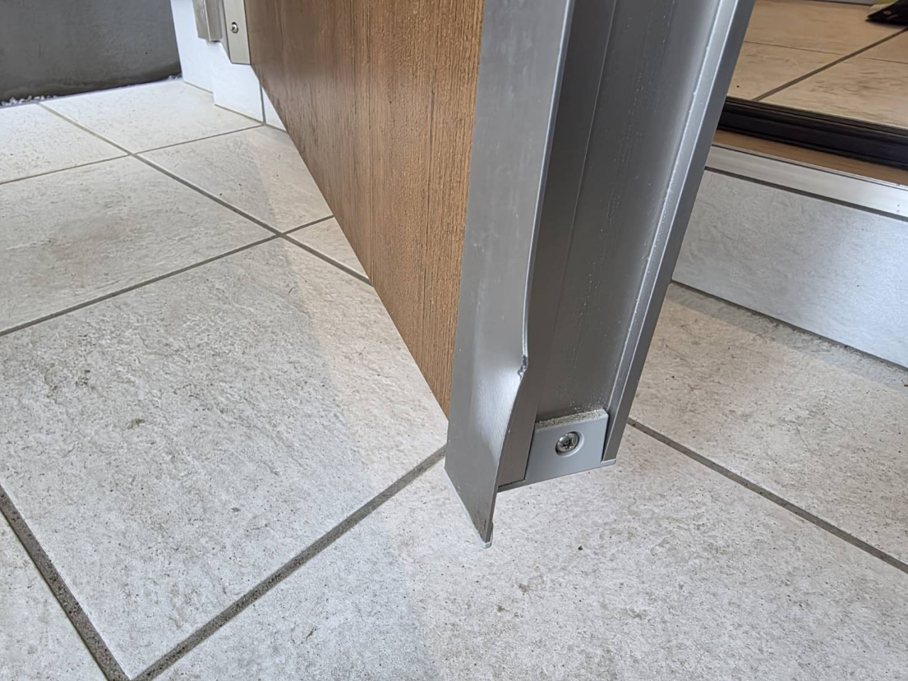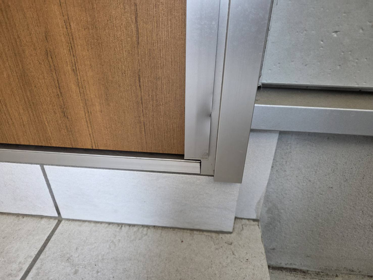 現場の状況としては、ドアストッパーが設置されておらず、強風時に扉が勢いよく開いてしまい、隣家の壁に接触。その衝撃でアルミ部分が凹んでしまったとのことでした。